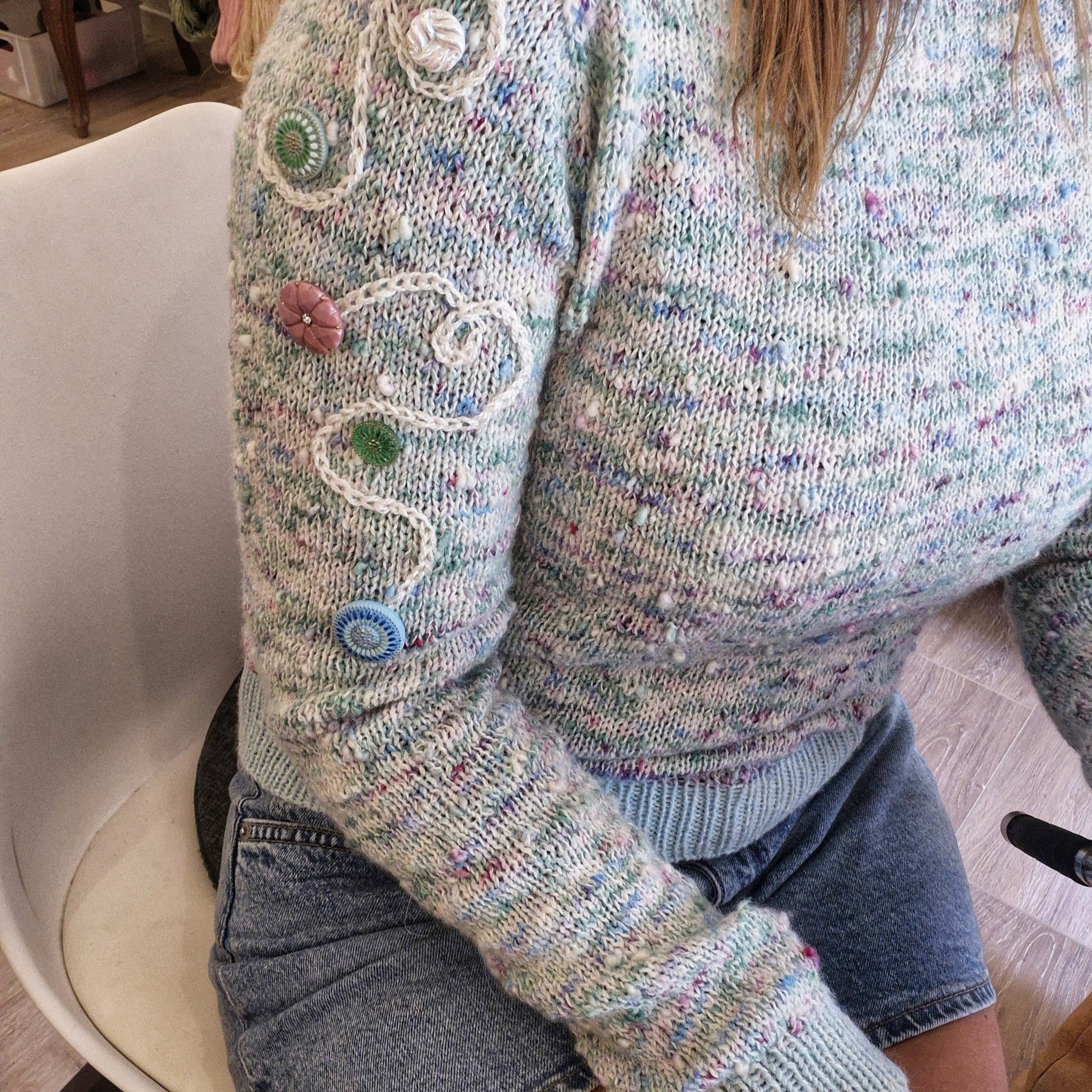 Langærmet sweater med sadelskuldre, som er strikket oppefra og ned. Sweateren er konstrueret således, at den først formes i nakken ved hjælp af vendepinde, og derefter strikkes der først skulderudtagninger, dernæst ærmeudtagninger på både på ret- og vrangpindene og senere raglan udtagninger på hver anden pind. Sweateren afsluttes med ribkanter og italiensk aflukning og dekoreres efter fri fantasi med broderi og smukke knapper.