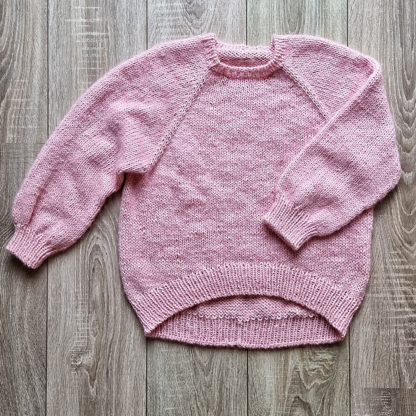 Lækker raglansweater med et lettere oversize fit og vendepinde i nakken. Ekstra længde over bagdelen, som også laves med vendepinde og afsluttes med en ribkant og italiensk aflukning.